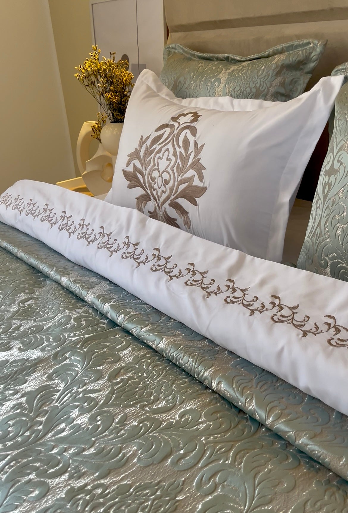 ✅ Set complet 6 pièces : couvre-lit + drap brodé + 4 taies d’oreiller
