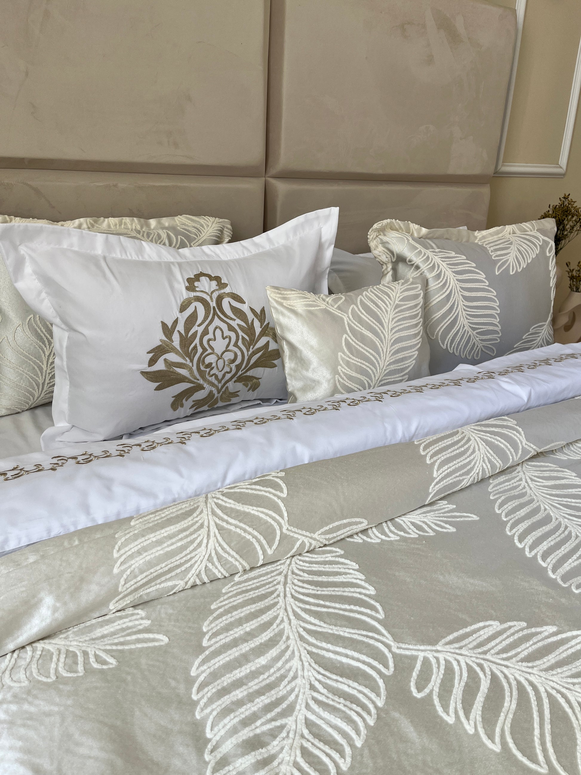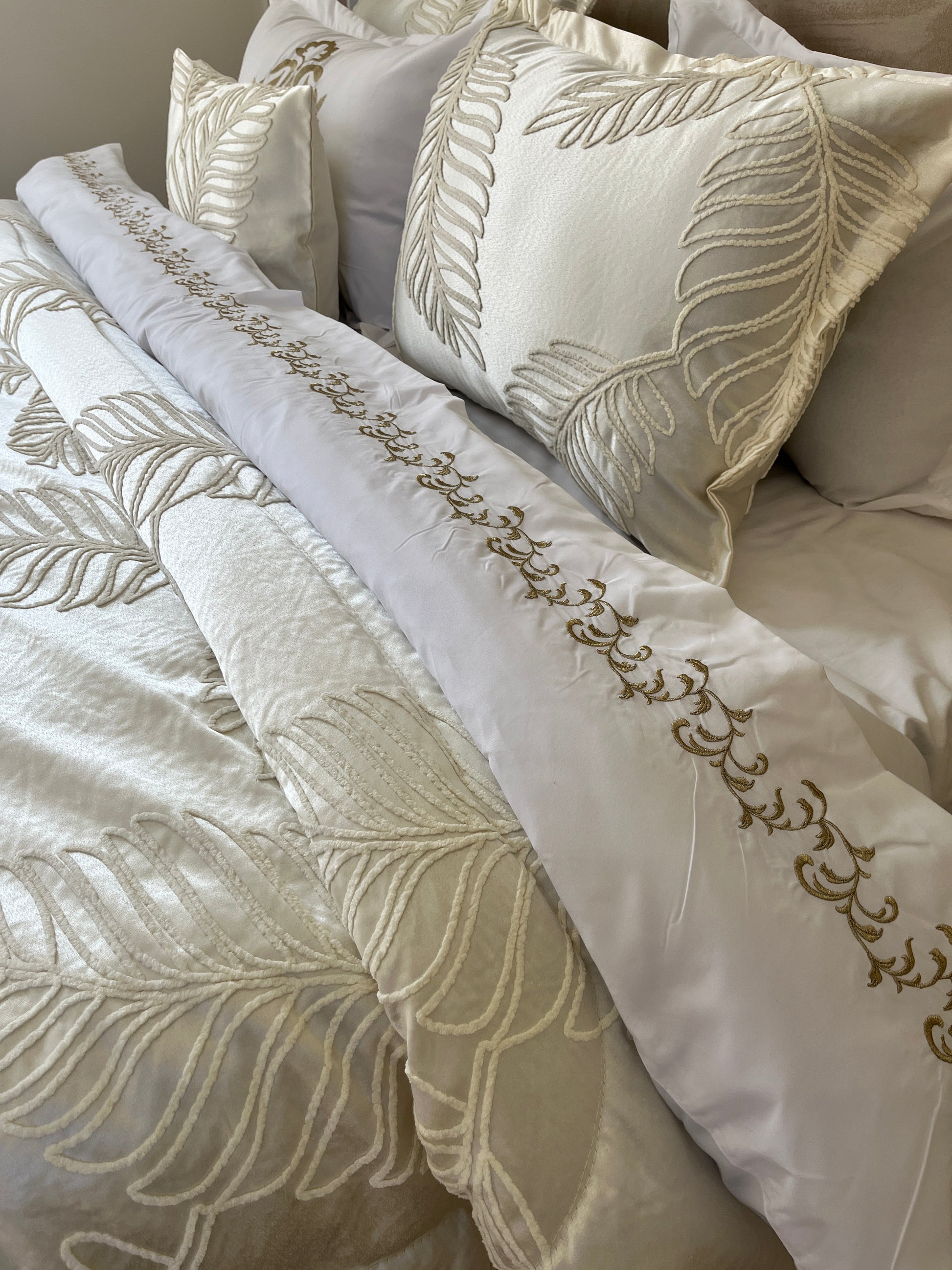 ✅ Set complet 6 pièces : couvre-lit + drap brodé + 4 taies d’oreiller